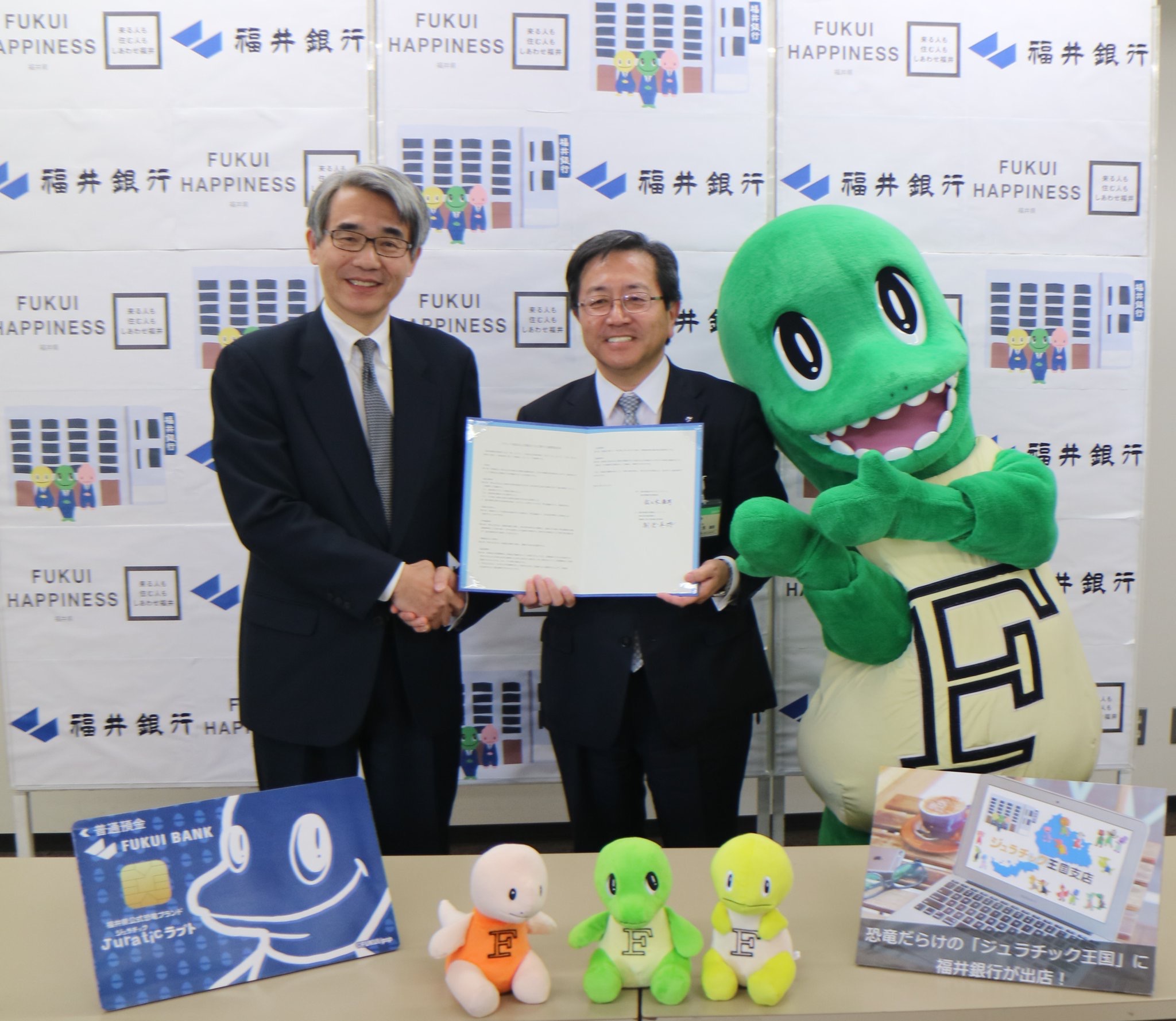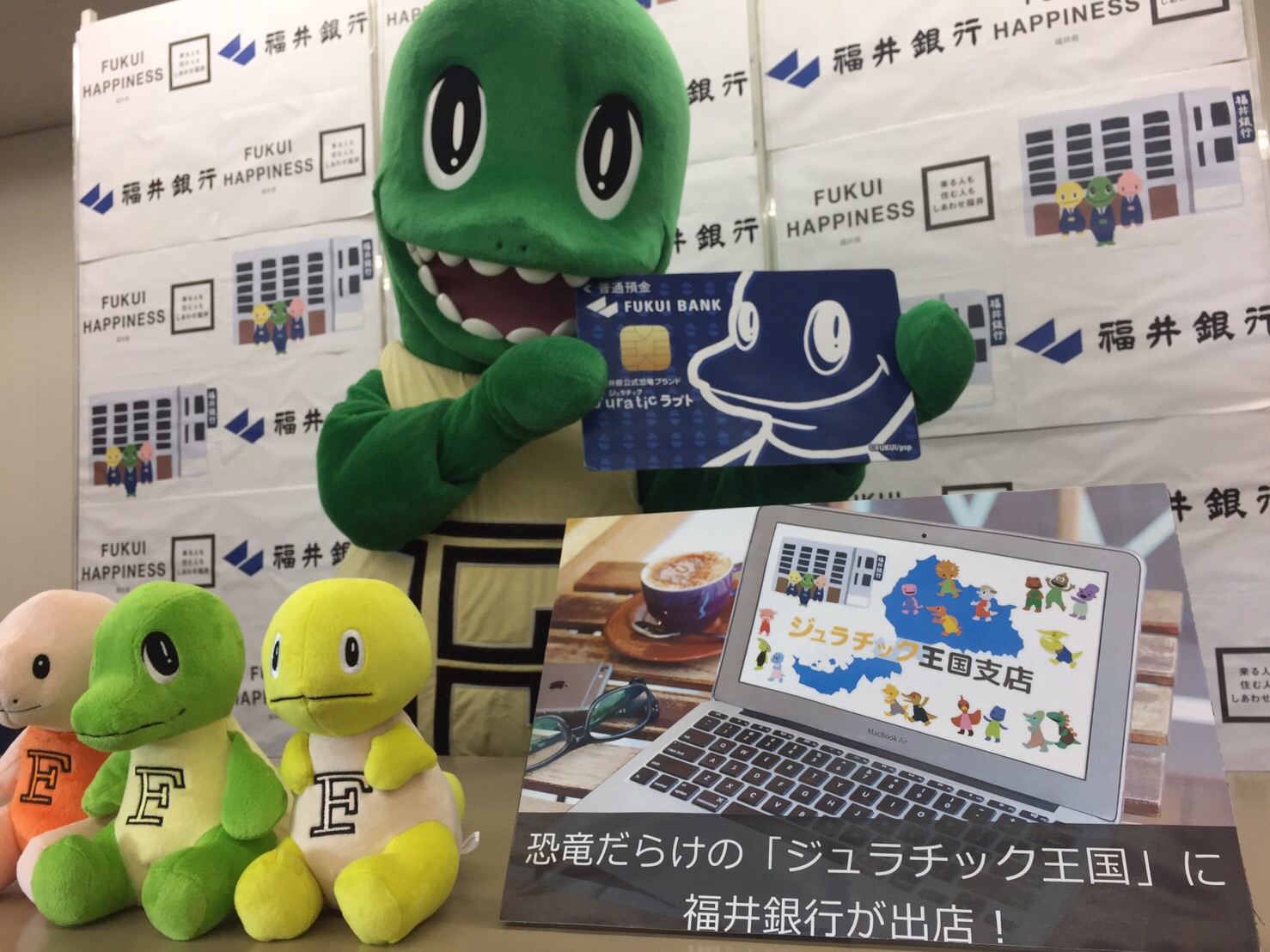 2017.02.28 福井銀行ジュラチック王国支店スタートじゅら! Tweet ラプトじゅらΣd(≧∀≦*) なんと、明日から始まる福井銀行さんのインターネット支店の名前が「ジュラチック王国支店」になったじゅらよー!!! これまでも、福井銀行さんは現金用封筒袋やノベルティシールにジュラチックを使ってくれてたじゅら☆ 福井県と福井銀行さんは今日から「ブランド発信および観光PRに関する連携協定」を結んだので、これから仲良く福井県を盛り上げていくじゅら~~♫