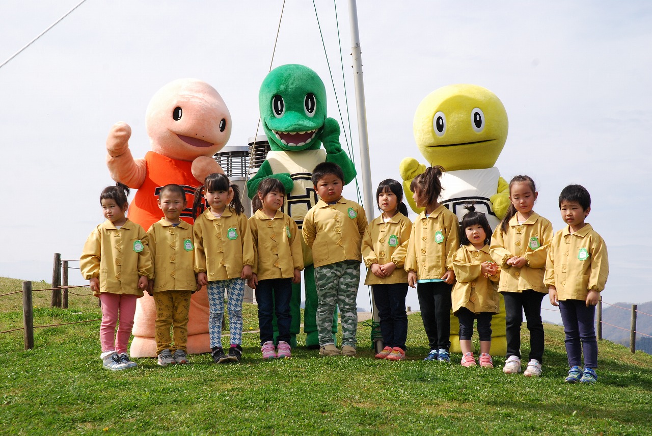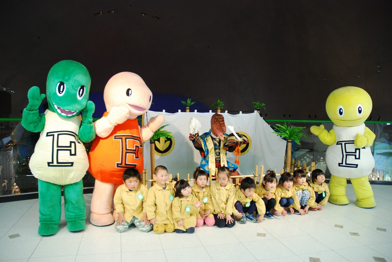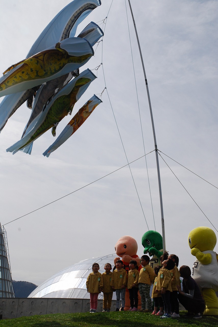 4月17日の恐竜の日に、勝山市立野向保育園のお友達と一緒に、「恐竜こいのぼり」の掲揚と「恐竜五月人形」のお披露目を行ったじゅらよヾ(≧▽≦)ノ