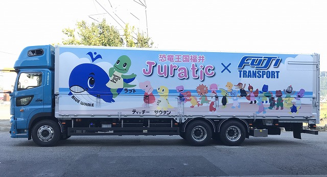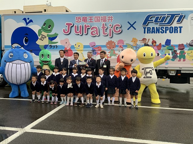 2019.10.08 ★☆Juraticラッピングトラックの出発式を実施☆★ Tweet ラプト、サウタン、ティッチーじゅら!! 今日、僕たちがデザインされた富士運輸㈱さんのラッピングトラック3台の出発式が行われたじゅら!! あさむつこども園のみなさんと一緒にジュラチック体操を踊れて楽しかったじゅら♪