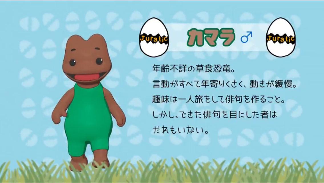 2017.12.18 カマラ【ジュラチック図鑑】 Tweet 名前 カマラ 性別 おとこのこ 恐竜 カマラサウルス 年齢不詳の草食恐竜。 言動がすべて年寄りくさく、動きが緩慢。 趣味は一人旅をして俳句を作ること。 しかし、できた俳句を目にしたものはいない。