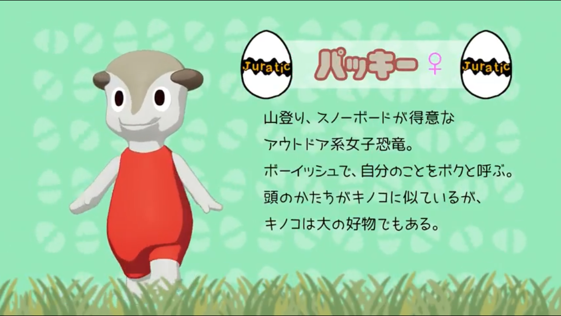 2018.01.01 パッキー【ジュラチック図鑑】 Tweet 名前 パッキー 性別 おんなのこ 恐竜 パキケファロサウルス 山登り、スノーボードが得意なアウトドア系女子恐竜。 ボーイッシュで自分の事をボクと呼ぶ。 頭のかたちがキノコに似ているが、キノコは大の好物でもある。