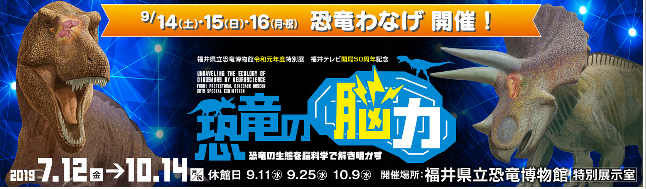 2019.09.13 ★☆3連休は恐竜博物館にお越しください☆★ Tweet ラプトじゅら( *´艸`) 今週末の3連休は恐竜博物館の開館時間が延長されるじゅら! 3連休に特別展「恐竜の脳力」に入場した人は「恐竜わなげ」にも参加できるじゅらよ(^^♪ 【開館時間】 8:30~18:00 ←9:00~17:00(延長前) 【恐竜わなげ】 各日 ①9時から12時 ②13時から16時まで