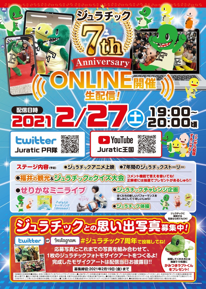 2021.02.04 ★☆ジュラチック7周年オンライン配信決定☆★ Tweet ジュラチックの誕生7周年を記念したオンライイベントの様子が2/27(土)19:00〜配信決定じゅら!! プレゼントが当たるクイズ大会やミニライブ、チャレンジ企画など、豪華な1時間をお届け(#^.^#) ツイッターかYouTubeでライブ配信するじゅらよ♪ 今年はオンラインでお祝いしてくれるとうれしいじゅら( *´艸`)